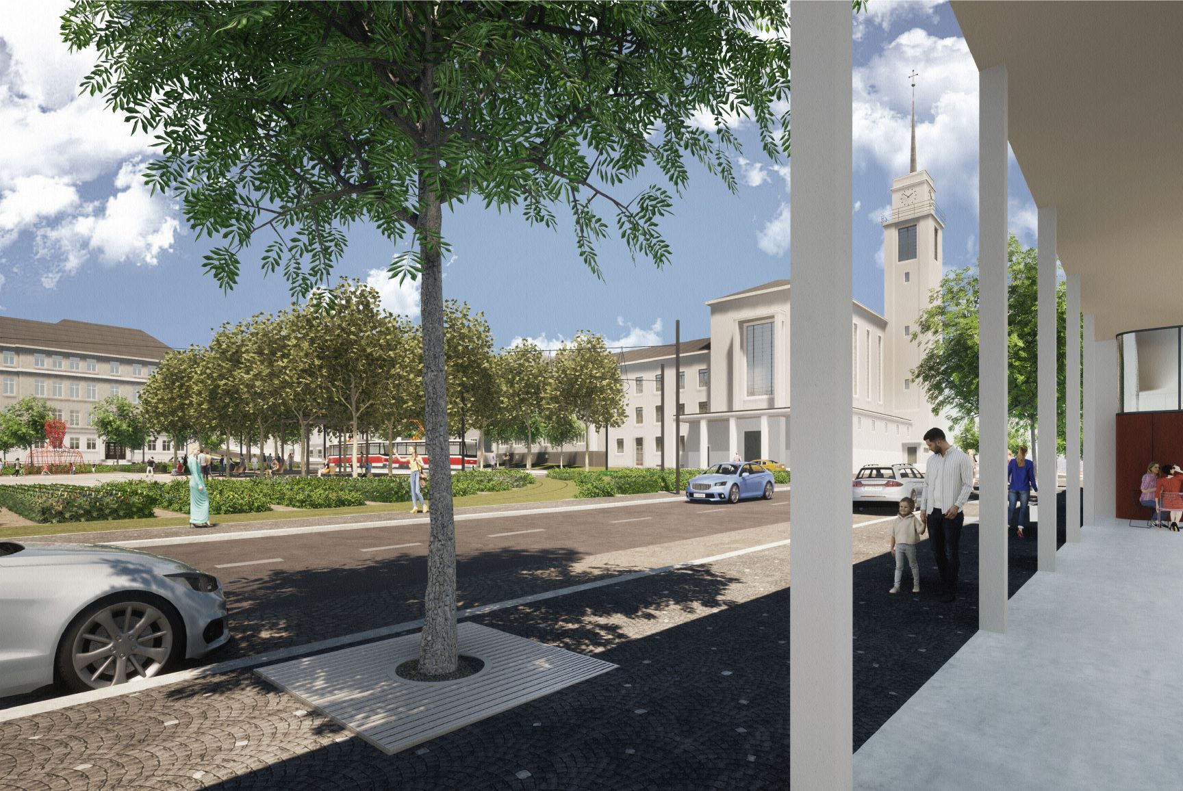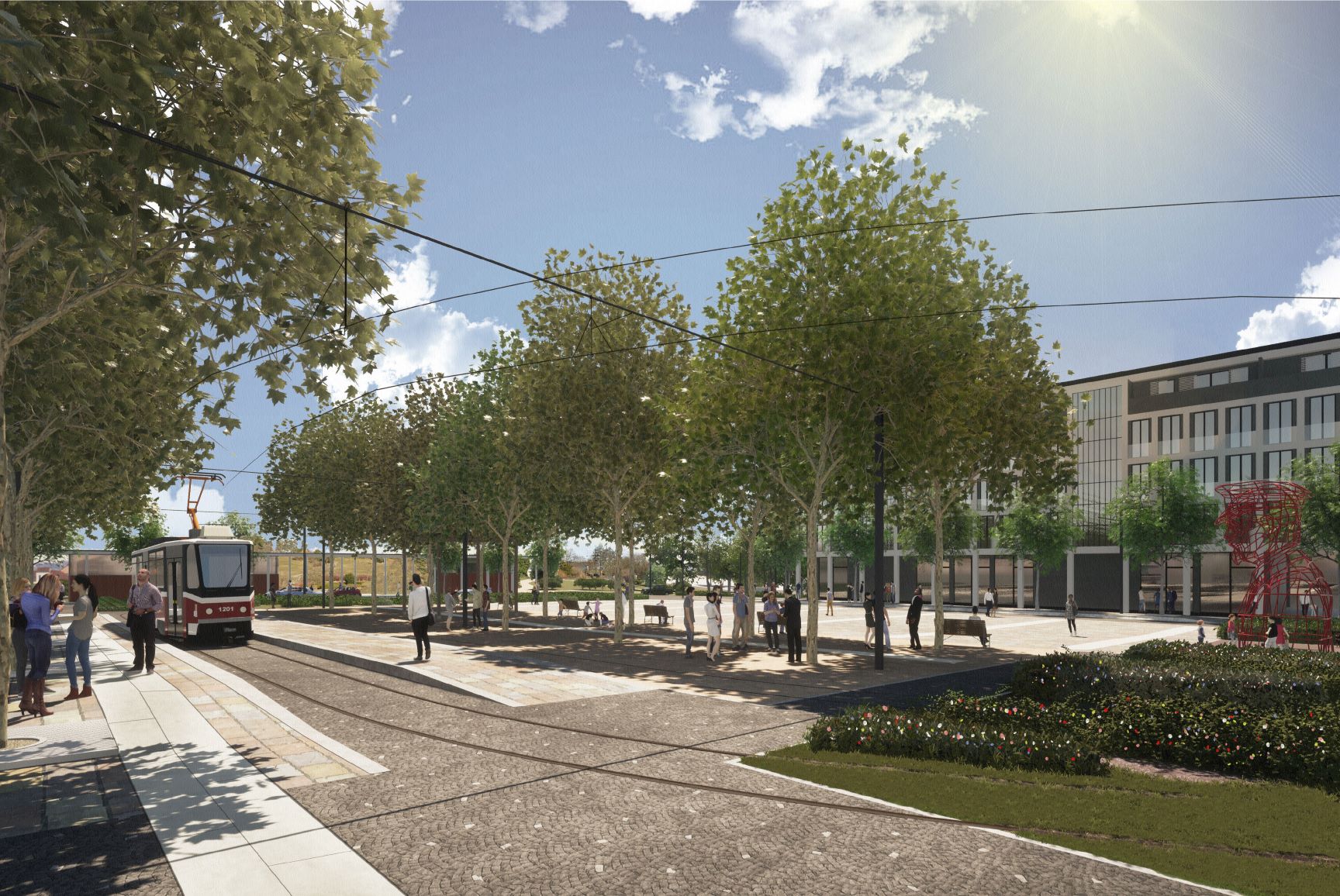 Autoři mysleli i na modrozelená řešení, většina střech polyfunkčního objektu bude zelená, využita budou i opatření na hospodaření s dešťovou vodou. Příjemné mikroklima na náměstí vytvoří také vzrostlé stromy a trvalkové záhony.