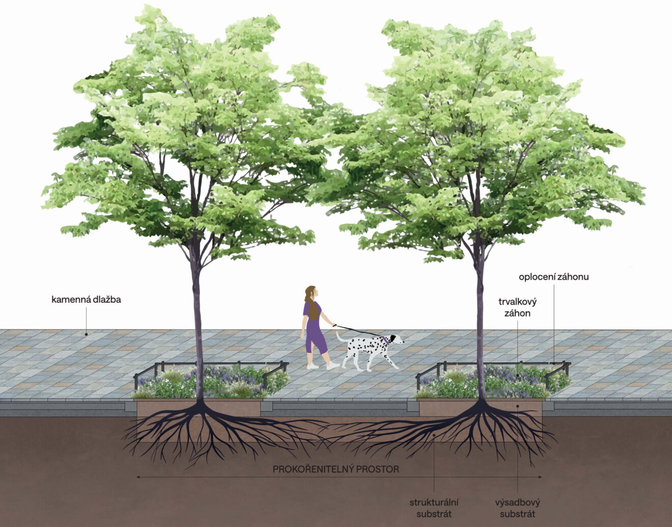 Principem řešení je zajištění dostatečně velkého prokořenitelného prostoru a zároveň dostupnost srážkové vody pomocí zásad modrozelené infrastruktury. Kořeny stromů mohou volně prorůstat vymezeným prostorem podkladní vrstvy. Nátok srážkové vody bude zajištěn spádem z okolních zpevněných ploch. Akumulace vody pak probíhá pouze v nejnižší části systému tak, aby k ní měly kořeny přístup, ale zároveň nedocházelo k jejich trvalému zatopení a uhnívání. Zajištěn je odtok přebytečné srážkové vody.