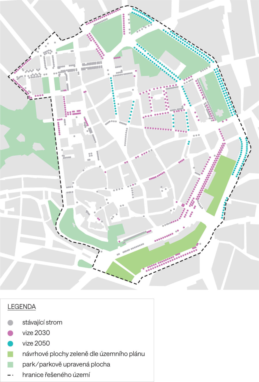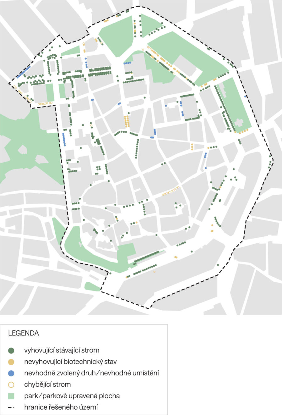 Stromořadí i solitérní stromy v centru Brna najdete, avšak i přes pečlivý výběr míst pro jejich výsadbu často nedokážou dorůst očekávané velikosti ani dostatečně zlepšit mikroklima svého okolí. Stromy, které se ujmou, prvních pár let viditelně prospívají, následně ale mohou stagnovat a poté i desítky let skomírat. Součástí vize vysadit až dvojnásobné množství stromů v centru Brna proto musí být tvorba takových podmínek, aby dlouhodobě prosperovaly ve všech očekávaných směrech.